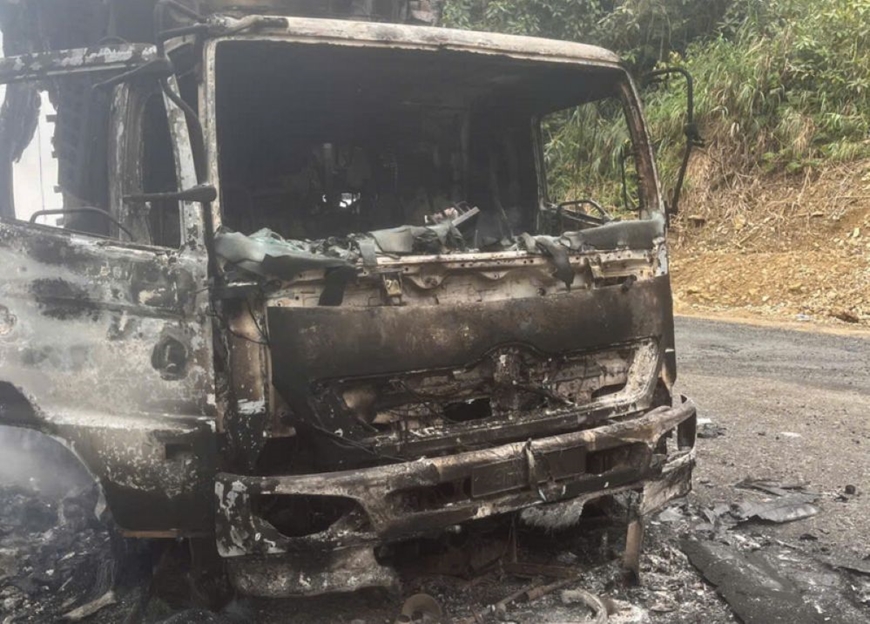 Sau sự cố hỏa hoạn, chiếc xe tải chỉ còn lại khung sắt. Ảnh: cand.com.vn
