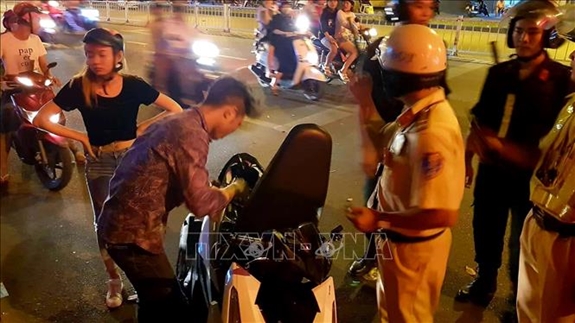 Lực lượng chức năng xử lý các trường hợp vi phạm trật tự an toàn giao thông. Ảnh: TTXVN |