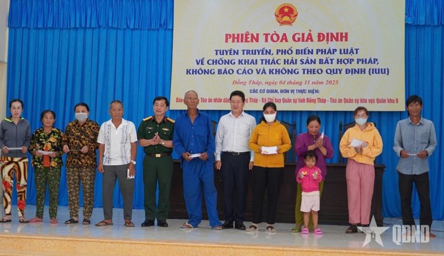 Bộ CHQS tỉnh Đồng Tháp vừa phối hợp với các cơ quan chức năng tổ chức phiên tòa giả định tuyên truyền, phổ biến pháp luật về chống khai thác hải sản bất hợp pháp, không báo cáo và không theo quy định (IUU) tại xã Gia Thuận và xã Tân Đông.
