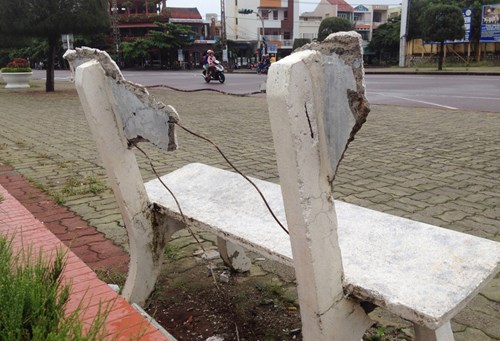 Ghế đá đặt tại quảng trường 1 Tháng 4 bị đập phá, trơ lõi sắt. Ảnh: Báo Phú Yên.