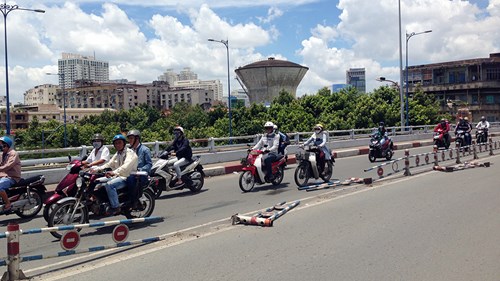 Bạn đọc Vương Sỹ Cường ở quận 5, TP TP Hồ Chí Minh phản ảnh: Dải phân cách trên cầu Nguyễn Tri Phương bắc qua kênh Tàu Hủ (nối liền quận 5 và quận 8) hiện bị hư hỏng nặng, nhiều thanh sắt đổ ra mặt đường gây nguy hiểm cho người tham gia giao thông.