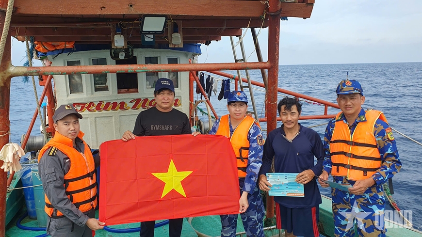 | Chi đội Kiểm ngư số 2 tặng cờ Tổ quốc và phát tờ rơi cho ngư dân. |