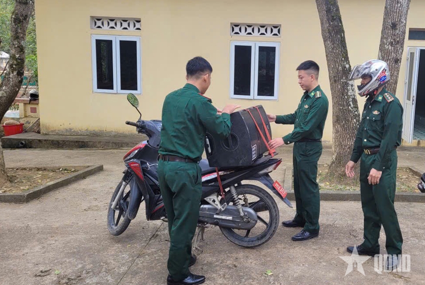 | Tổ công tác chuẩn bị loa kéo tay đến các bản để tuyên truyền pháp luật. |