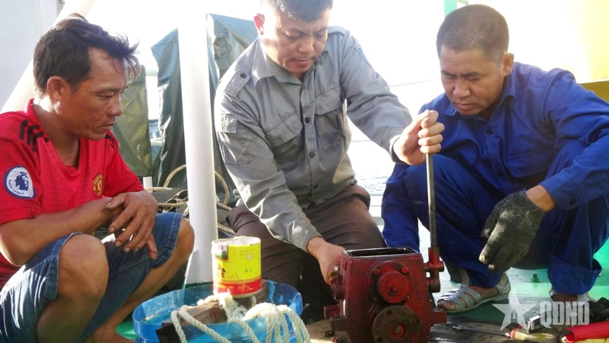 | Nhân viên kỹ thuật thuộc Chi đội Kiểm ngư số 4 khắc phục sự cố hỏng máy tàu giúp ngư dân trên biển. |