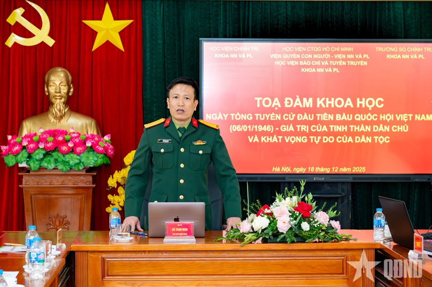 | Đại tá, TS Đỗ Xuân Đoài, Phó chủ nhiệm Khoa Nhà nước và Pháp luật chủ trì tọa đàm "Ngày Tổng tuyển cử đầu tiên bầu Quốc hội Việt Nam". Ảnh: TRUNG THÀNH |