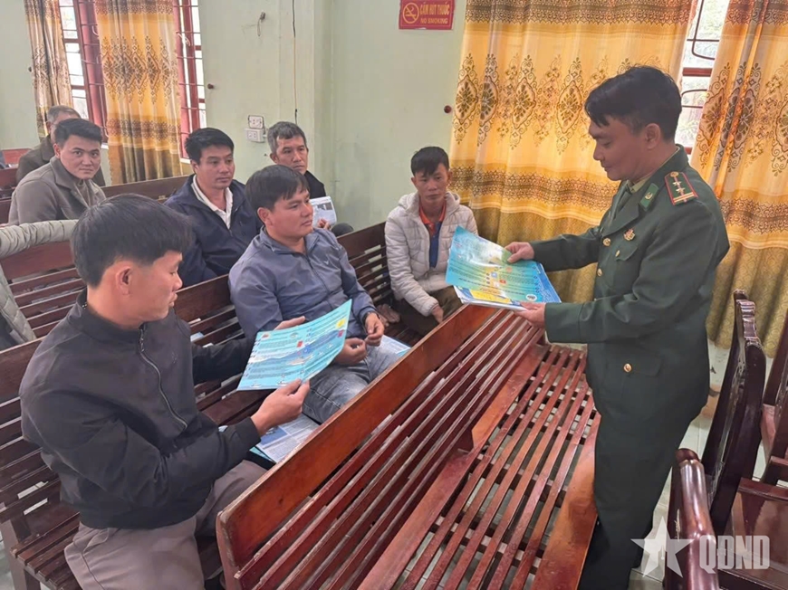 | Cán bộ Đồn Biên phòng Quỳnh Phương phát tờ rơi tuyên truyền phòng, chống khai thác IUU cho ngư dân địa bàn. |