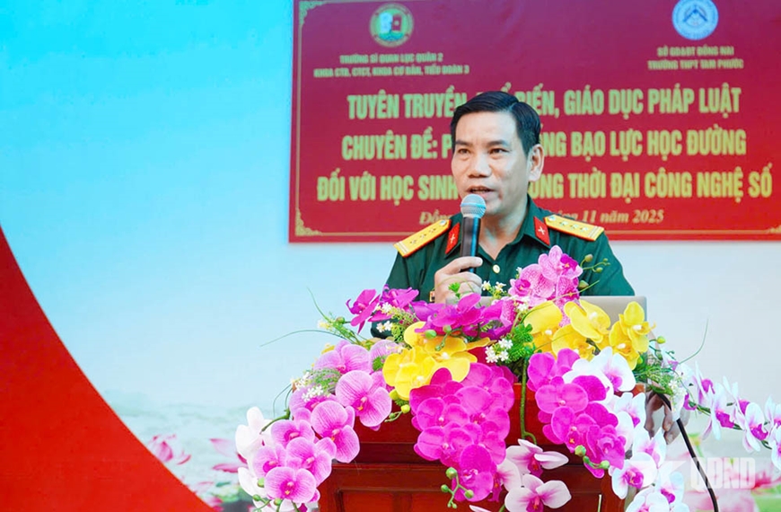 Với chủ đề: “Phòng, chống bạo lực học đường đối với học sinh THPT trong thời đại công nghệ số”, các giảng viên Trường Sĩ quan Lục quân 2 đã truyền đạt cho học sinh những kiến thức pháp luật gắn với thực tiễn đời sống học đường; hướng dẫn cách ứng xử văn hóa và giao tiếp lành mạnh giúp học sinh nhận thức rõ hơn về hậu quả của bạo lực học đường. Qua đó, giáo dục học sinh biết “nói không với bạo lực học đường”, cùng xây dựng “Trường học thân thiện, học sinh tích cực”, lan tỏa thông điệp “Yêu thương - Tôn trọng - Chia sẻ để cùng nhau học tốt, sống đẹp”.