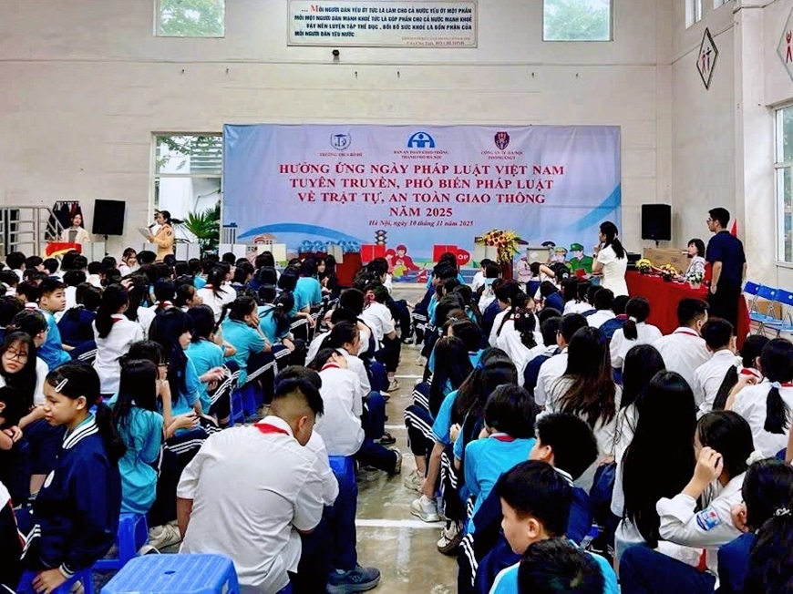 Ngày 10-11, Phòng Cảnh sát giao thông (CSGT) Công an TP Hà Nội phối hợp với Ban An toàn giao thông (ATGT) Thành phố tổ chức buổi tuyên truyền pháp luật về trật tự, an toàn giao thông tại Trường THCS Bồ Đề (phường Bồ Đề, TP Hà Nội).