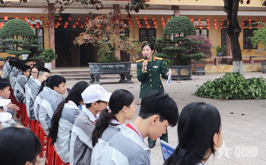 | Thiếu tá Nguyễn Thị Huân, Phó viện trưởng Viện Kiểm sát quân sự Khu vực 32 tuyên truyền, trao đổi với học sinh Trường THCS Hàn Thuyên. |