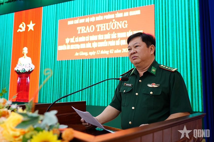 | Đại tá Phạm Văn Thắng, Phó chỉ huy trưởng Bộ Chỉ huy Quân sự tỉnh, Chỉ huy trưởng Ban chỉ huy Bộ đội Biên phòng tỉnh An Giang phát biểu chỉ đạo tại buổi trao thưởng. |