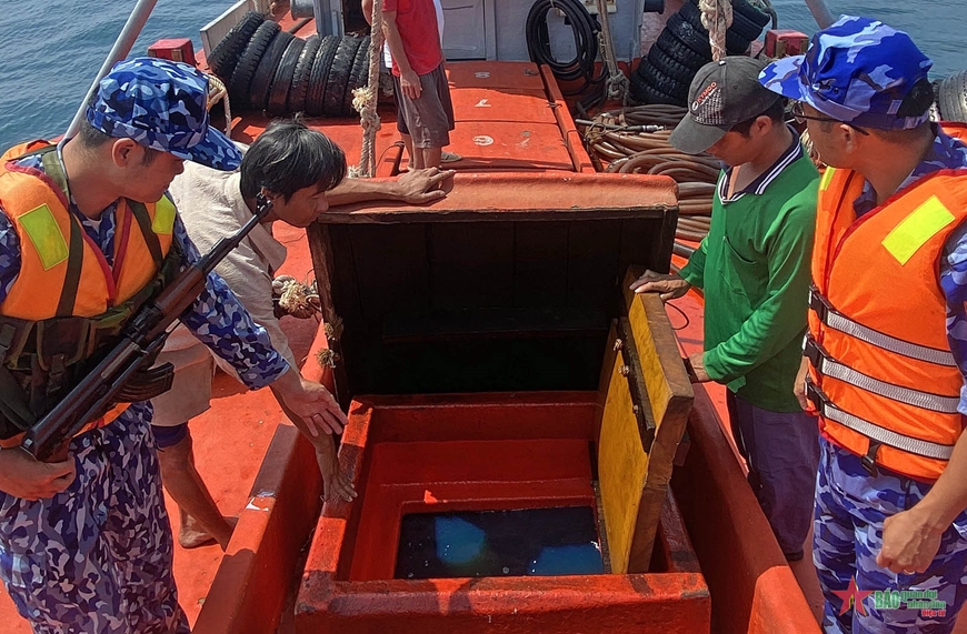 Tại vùng biển TP Phú Quốc, tỉnh Kiên Giang, Đoàn Trinh sát số 2 Cảnh sát biển vừa phát hiện, bắt giữ tàu TG 90338 TS có hành vi vận chuyển hàng hóa không có hóa đơn, chứng từ chứng minh nguồn gốc hợp pháp.