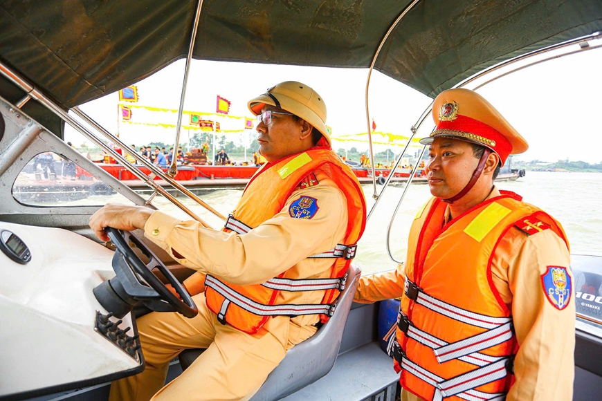 Lực lượng Cảnh sát đường thủy sử dụng cano chuyên dụng chạy song song hai bên sườn đoàn rước, tạo “hành lang an toàn”, sẵn sàng xử lý các tình huống phát sinh. Đồng thời, các tổ công tác liên tục tuần tra, nhắc nhở người tham gia lễ hội mặc đầy đủ áo phao, chấp hành hướng dẫn của lực lượng chức năng, tuyệt đối không chen lấn, xô đẩy khi lên xuống phương tiện.
