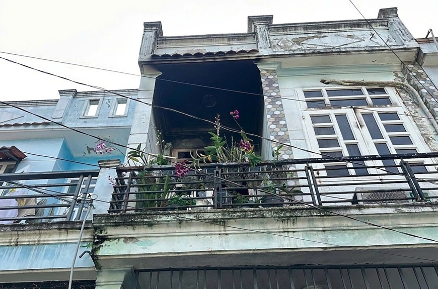 | Bức tường ở lầu một ám khói đen, 3 người trong nhà bị bỏng đã trèo ra lan can, qua nhà hàng xóm để thoát thân. Ảnh: Vnexpress |