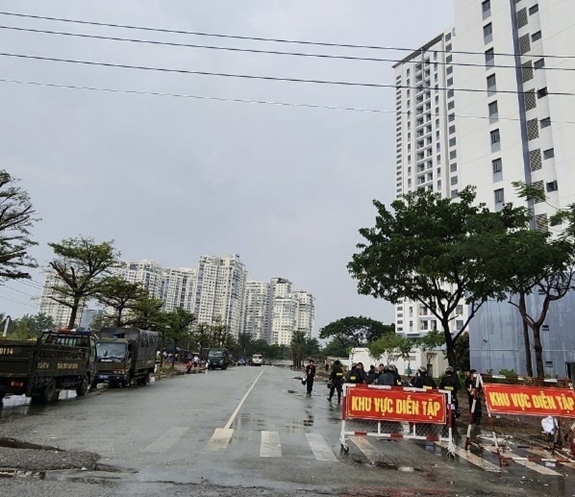 Khu vực tòa nhà tái định cư của Tập đoàn Novaland (26 Mai Chí Thọ, phường An Khánh, TP.Thủ Đức, TP Hồ Chí Minh đang diễn ra hoạt động diễn tập của Công an TP Hồ Chí Minh. |