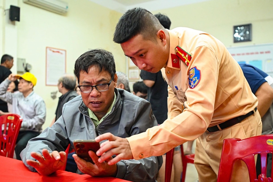 Công an phường Ngọc Hà hướng dẫn người dân làm sạch dữ liệu phương tiện và giấy phép lái xe.