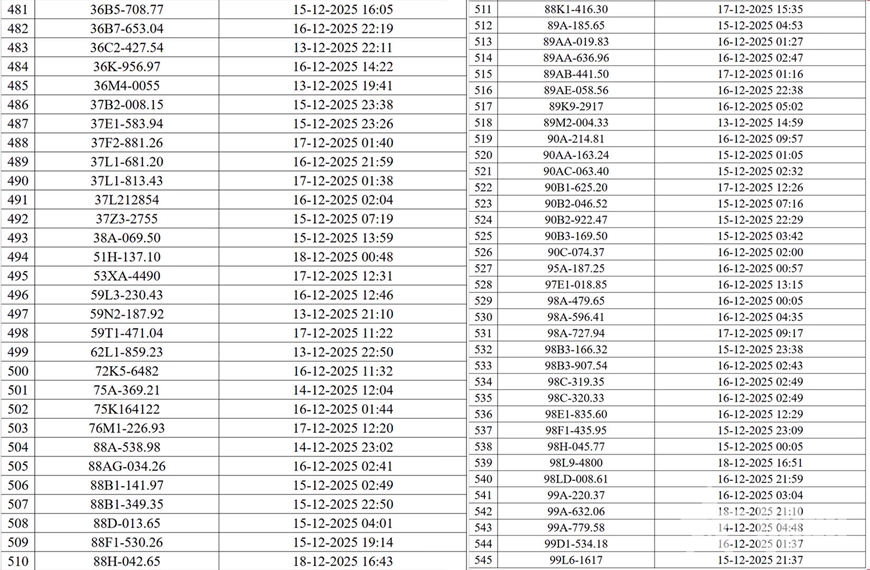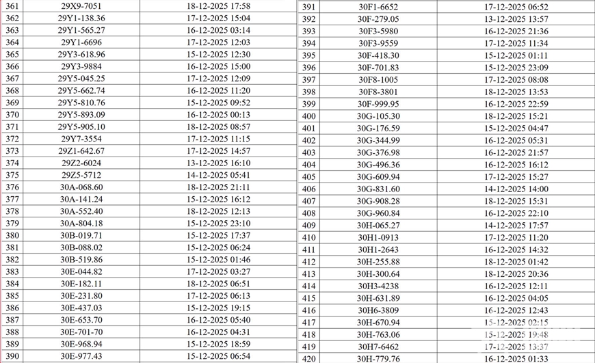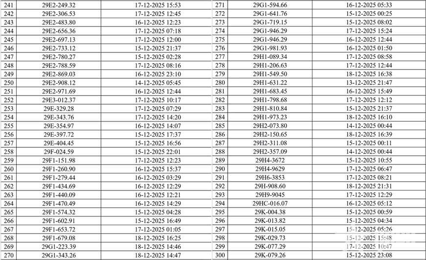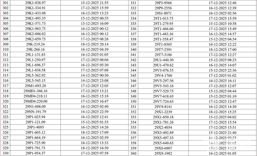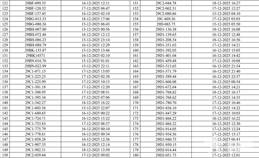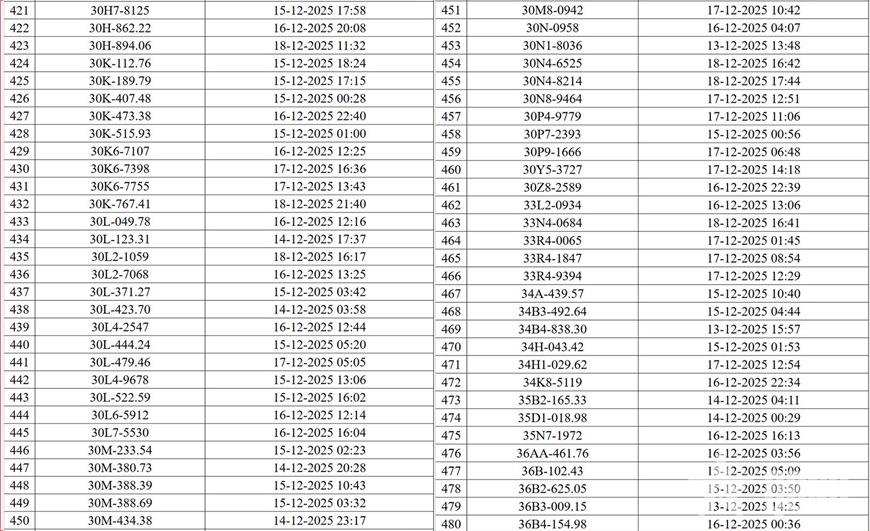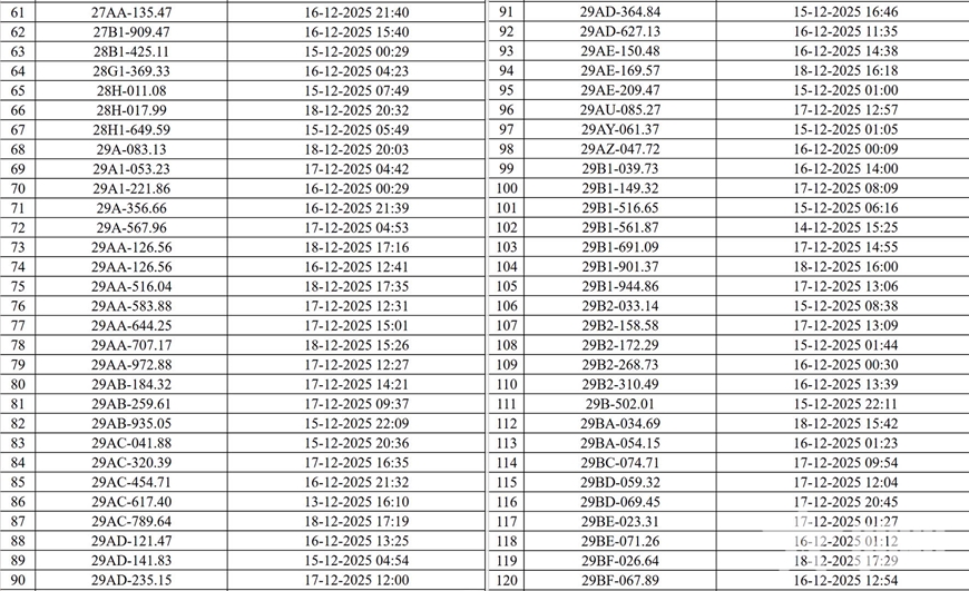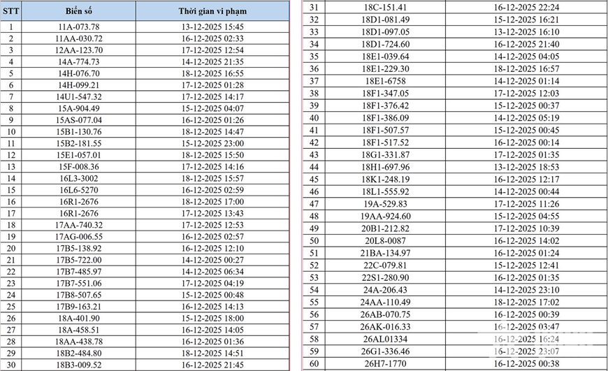Lực lượng chức năng vừa công bố danh sách phương tiện vi phạm giao thông bị camera AI ghi nhận phạt nguội (từ ngày 13-12 đến 18-12-2025).