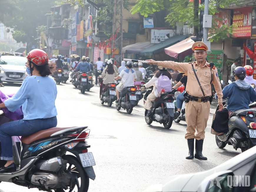 Cùng với công tác phân luồng, cảnh sát giao thông Hà Nội tích cực hỗ trợ người dân qua các điểm di chuyển khó khăn. |