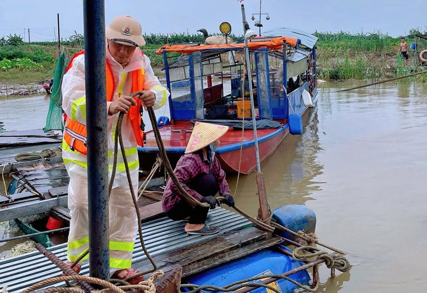 Sáng 6-10, tổ công tác do Thiếu tá Lê Văn Hải (Đội Cảnh sát đường thủy số 2) làm tổ trưởng, trực tiếp đến các khu vực sông Hồng đoạn qua xã Bát Tràng (Hà Nội) và vùng giáp ranh để kiểm tra tình hình nước sông, công tác neo đậu phương tiện và hoạt động vận chuyển hành khách.