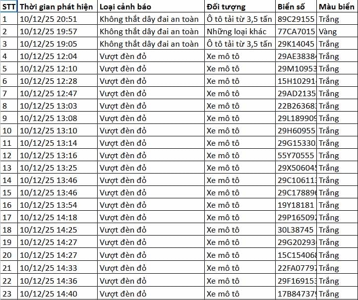 Thông tin từ Cục Cảnh sát giao thông (CSGT), Bộ Công an, trong khoảng thời gian từ 12 giờ ngày 10-12-2025 đến 12 giờ ngày 11-12-2025, hệ thống camera ứng dụng trí tuệ nhân tạo (AI) tiếp tục phát huy hiệu quả trong giám sát, phát hiện vi phạm giao thông trên địa bàn Hà Nội và tuyến cao tốc Nội Bài - Lào Cai.