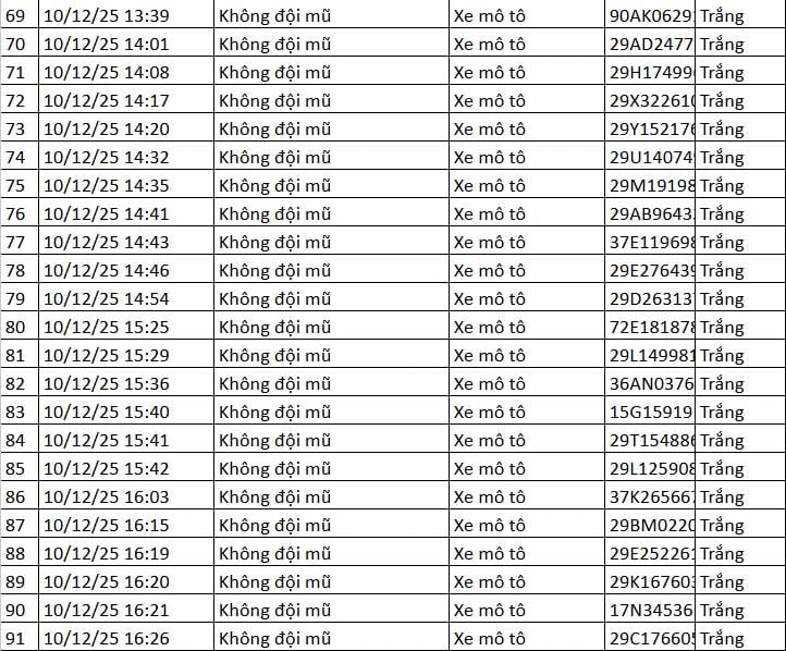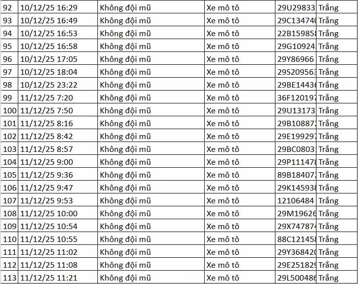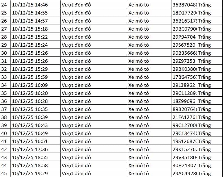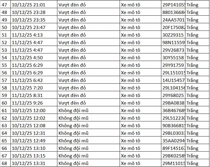Theo đó, từ 12 giờ ngày 10-12-2025 đến 12 giờ ngày 11-12-2025, hệ thống đã phát hiện 52 trường hợp không đội mũ bảo hiểm và 79 trường hợp không chấp hành hiệu lệnh của đèn tín hiệu giao thông (vượt đèn đỏ). Hệ thống ghi nhận không có trường hợp nào đi ngược chiều trong khoảng thời gian này.