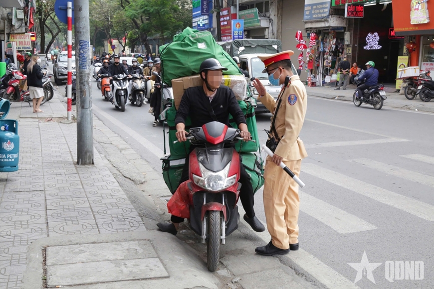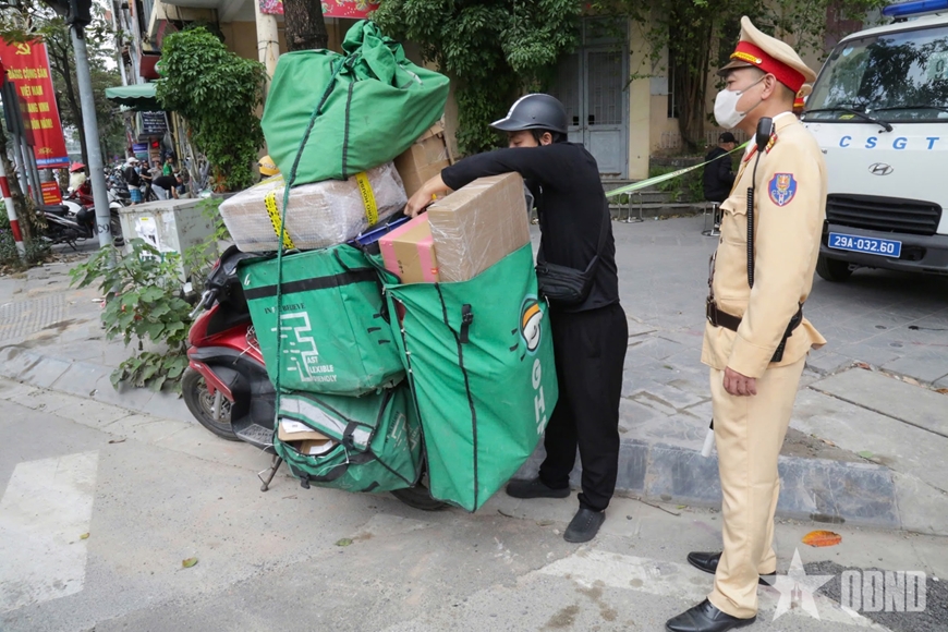 Nhiều shipper bị phát hiện chở hàng hóa cồng kềnh, che khuất biển kiểm soát, gây nguy hiểm cho các phương tiện khác khi lưu thông trên đường. Là một trong những trường hợp vi phạm, anh T.V.Q. (SN 1992, trú tại Hà Nội) thừa nhận hành vi chở hàng làm che khuất biển số xe máy. “Tôi không để ý việc hàng hóa che mất biển số. Sau lần này tôi cam kết không tái phạm”, anh Q. nói. Ngoài việc lập biên bản xử phạt, lực lượng CSGT yêu cầu anh tháo dỡ hàng hóa, khôi phục nguyên trạng biển kiểm soát phương tiện.