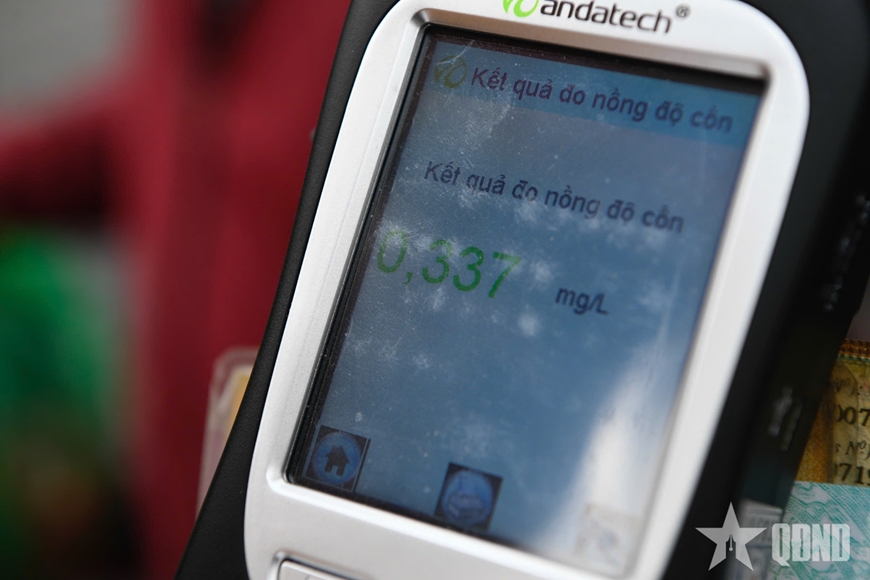 Ghi nhận thực tế, trong khoảng 1 tiếng, đã có 10 trường hợp người điều khiển xe mô tô vi phạm được phát hiện, trong đó có 2 trường hợp vi phạm nồng độ cồn ở mức 2 (vượt quá 0,25mg đến 0,4mg/lít khí thở), còn lại vi phạm ở mức 1 (chưa vượt quá 0,25 mg/lít khí thở).