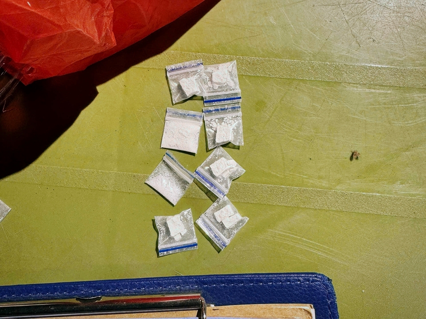 Qua kiểm tra, lực lượng chức năng phát hiện trên người đối tượng có 8 túi nilon dạng zip kích thước 2x2cm, trong đó có 7 túi chứa chất bột màu trắng nghi là ma túy heroin và 1 túi chứa tinh thể màu trắng nghi là ma túy đá.