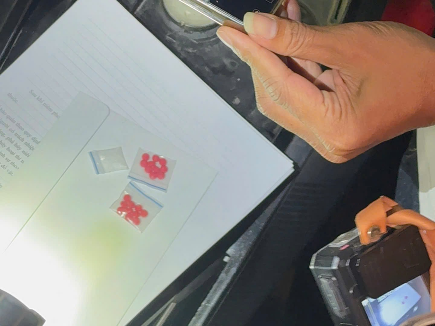 Quá trình kiểm tra, tổ công tác phát hiện bên trong cốp xe do C. điều khiển có 1 găng tay lao động màu trắng xanh, bên trong chứa 1 túi nilon kích thước khoảng 6,5x9cm, trong đó có 2 túi nilon nhỏ (kích thước khoảng 3x3cm) mỗi túi chứa 10 viên nén màu đỏ và 1 túi nilon chứa tinh thể màu trắng dạng rắn. Tại chỗ, người này khai tên là N.V.C (sinh năm 1984, trú tại xã Phú Xuyên, TP Hà Nội) đồng thời khai nhận số viên nén màu đỏ là ma túy “ngựa”, còn tinh thể màu trắng là ma túy “đá”, do đối tượng mua về để sử dụng.