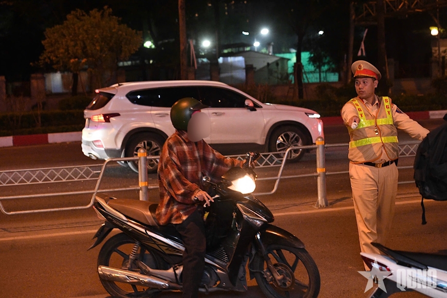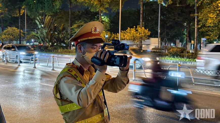 Ghi nhận trên đường Võ Chí Công - Xuân La (Hà Nội) tối 14-11, tổ tuần tra của Đội CSGT đường bộ số 2 (phòng CSGT Công an TP Hà Nội) cùng Công an phường Tây Hồ sử dụng thiết bị ghi hình chuyên dụng ban đêm để quan sát, phát hiện những người đang điều khiển xe máy sử dụng điện thoại, đeo tai nghe...