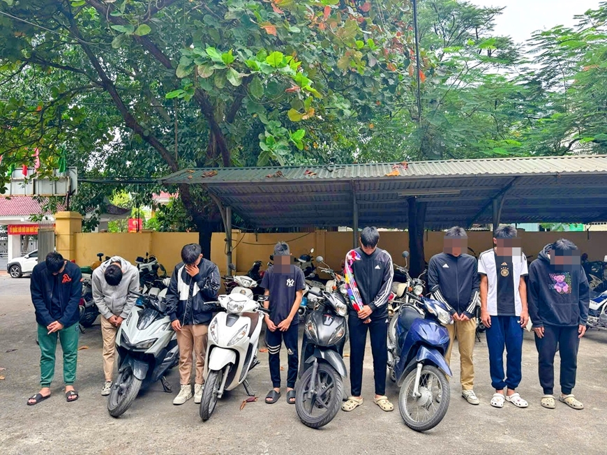 Các phương tiện và 8 thanh niên vi phạm tại cơ quan công an.