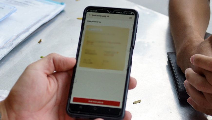 CSGT kiểm tra giấy phép lái xe của tài xế trên ứng dụng. |