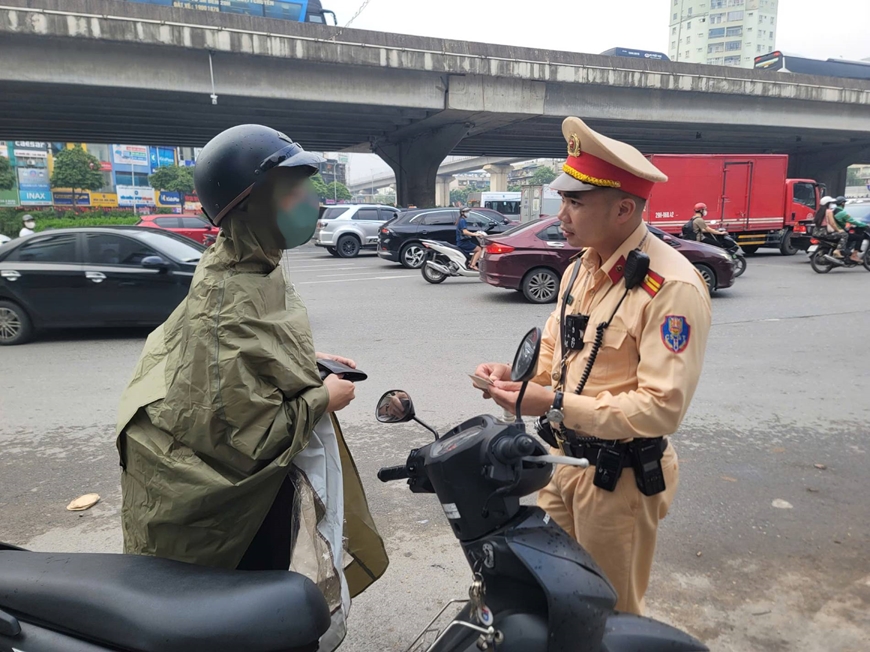 Sáng 19-6, Đội Cảnh sát giao thông (CSGT) đường bộ số 7 (Phòng CSGT Công an TP Hà Nội) lập chốt xử lý tình trạng đi xe máy trên vỉa hè tại nút giao Nguyễn Trãi - Nguyễn Xiển (quận Thanh Xuân, Hà Nội).