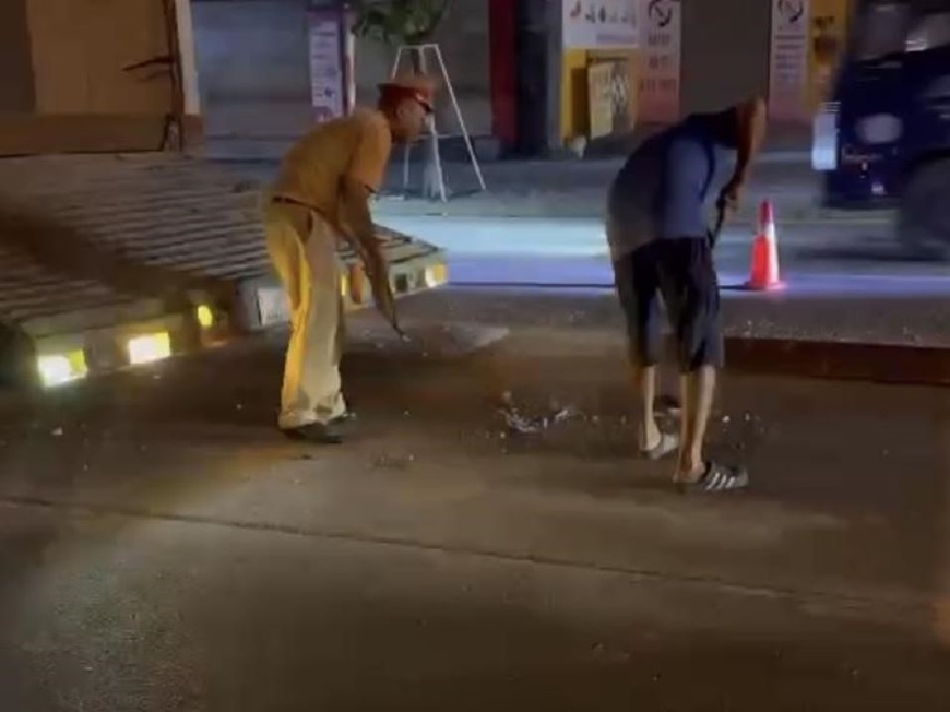 Ngoài việc xử lý vi phạm, tổ công tác cùng tài xế thu dọn các mảnh bê tông vỡ trên đường, bảo đảm an toàn giao thông.