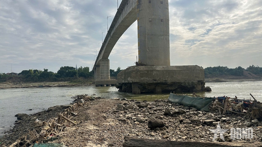 | Cận cảnh móng cọc trụ T3 cầu sông Lô bị hư hỏng nặng, mất gần hết lớp bê tông bảo vệ. |
