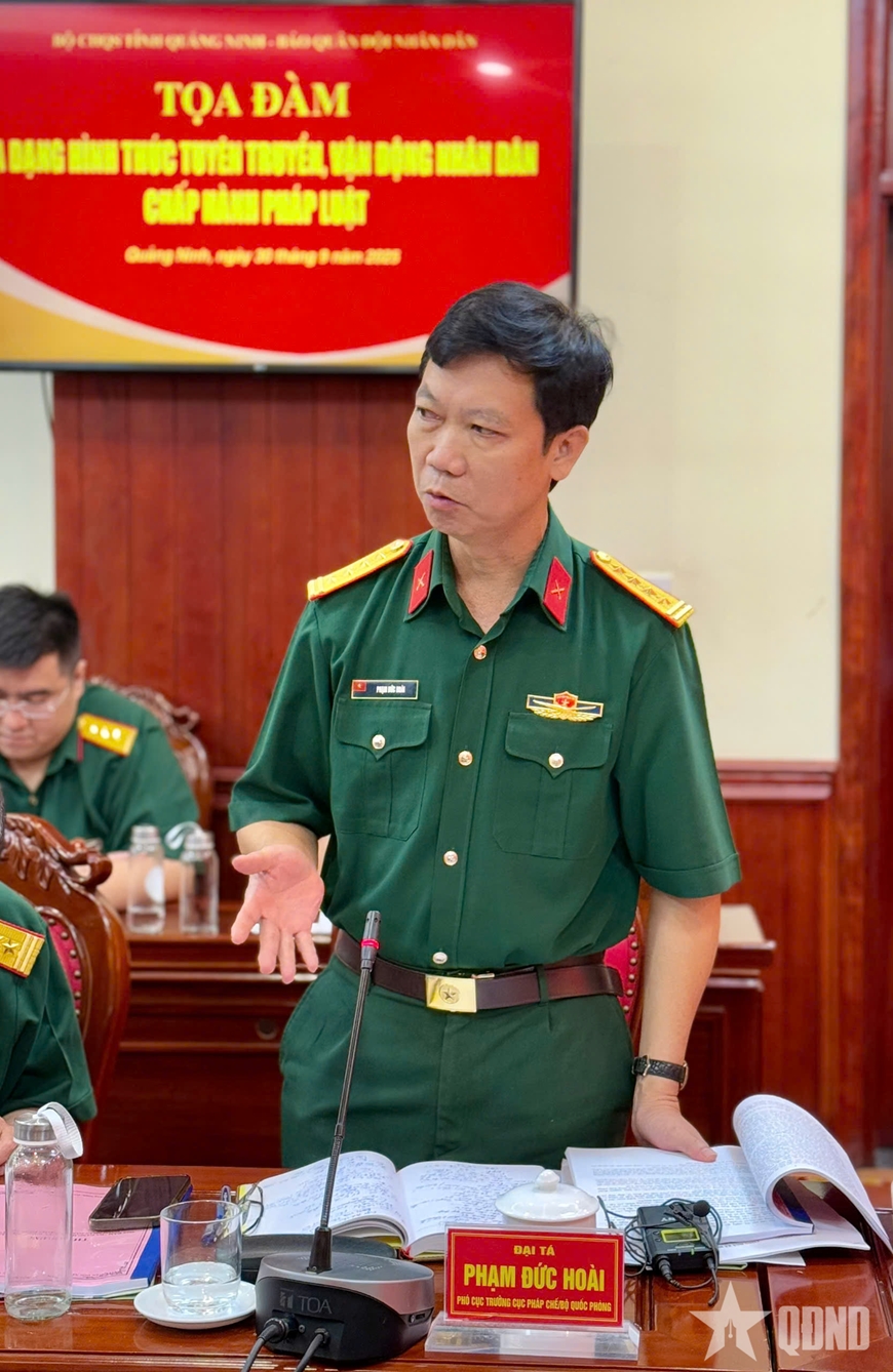 Dự tọa đàm có: Đại tá Vũ Văn Hoài, Phó chủ nhiệm Chính trị Quân khu 3; Đại tá Phạm Đức Hoài, Phó cục trưởng Cục pháp chế Bộ Quốc phòng; Đại tá Lê Ngọc Long, Phó tổng biên tập Báo Quân đội nhân dân; Sở Tư pháp cùng đại diện các đơn vị, ban, ngành, đoàn thể trên địa bàn tỉnh Quảng Ninh.