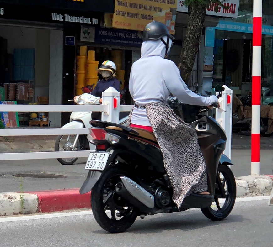 | Người tham gia giao thông sử dụng trang phục chống nắng gây vướng víu, mất an toàn. |