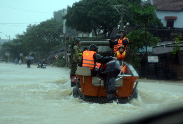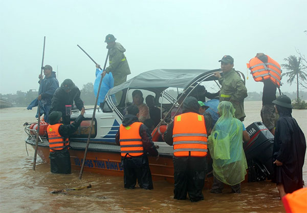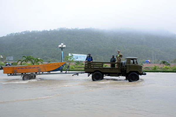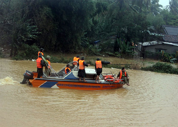 Lực lượng Bộ CHQS tỉnh Bình Định cơ động xuồng cứu hộ đến những điểm ngập lụt để di dời nhân dân.