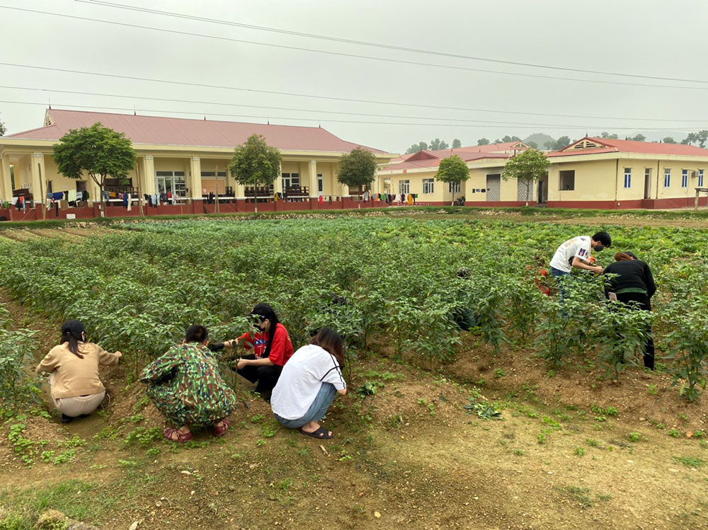Nhiều thanh niên đang thực hiện cách ly rất vui khi được cùng bộ đội tham gia tăng gia, làm vệ sinh trong khuôn viên nhà trường.