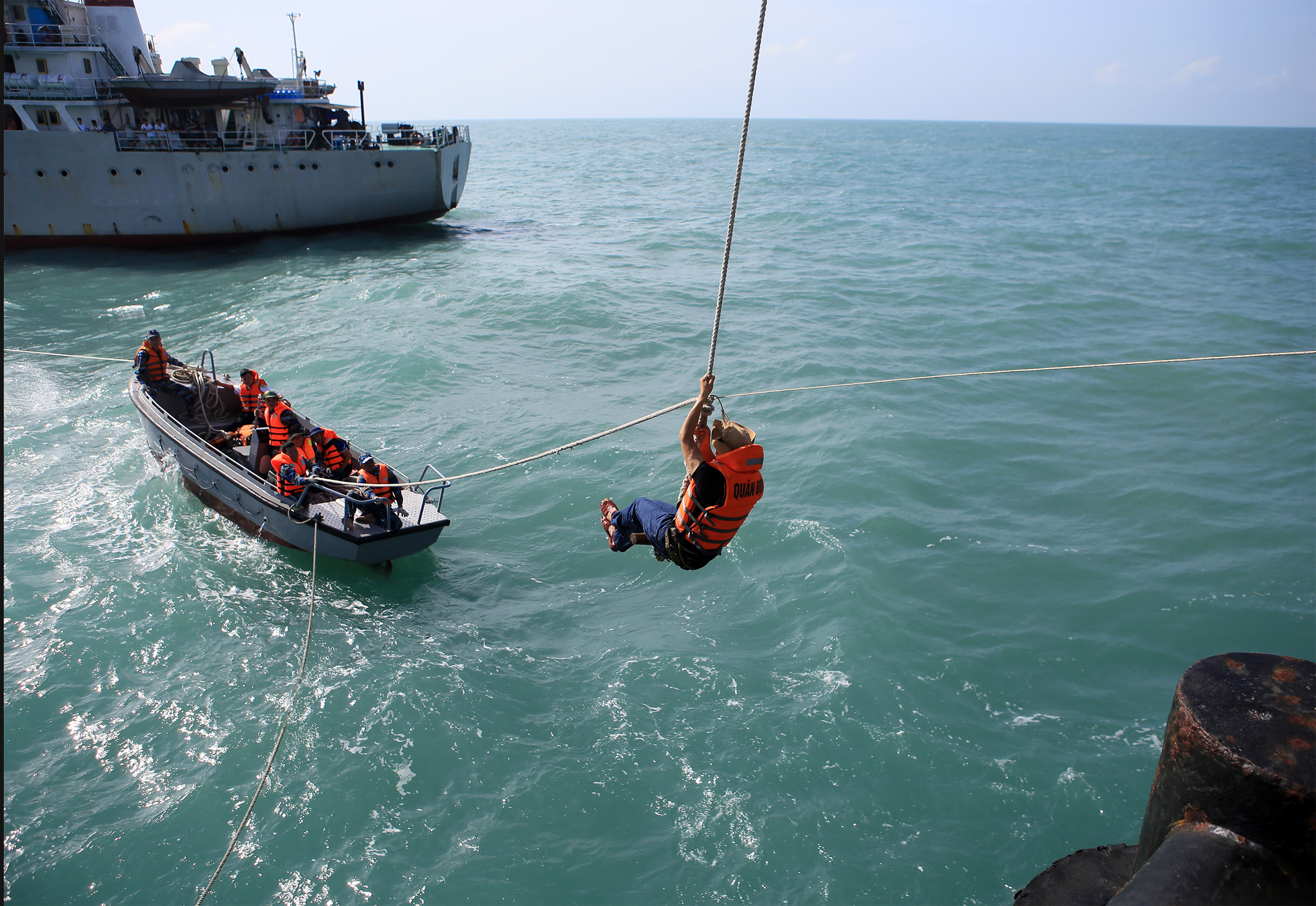 Thủy thủ tàu Trường Sa 19 phối hợp đón dây từ nhà giàn thả xuống.