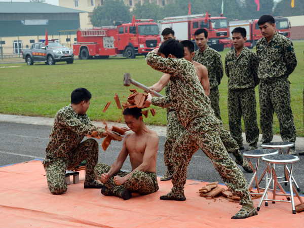 Các chiến sĩ thuộc Tiểu đoàn đặc công 20 anh hùng biểu diễn chui qua vòng lửa...
