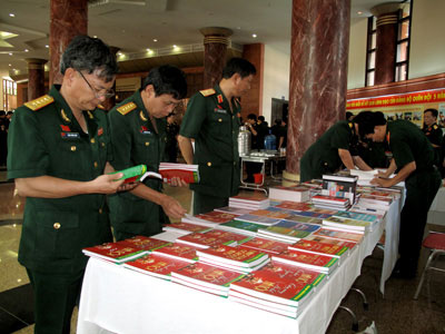Đại biểu tham quan các khu trưng bày sản phẩm phong phú của nhiều đơn vị, doanh nghiệp quân đội. Trong ảnh là gian trưng bày sách của Nhà xuất bản Quân đội nhân dân và Công ty cổ phần 26 (Tổng cục Hậu cần).