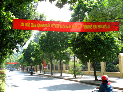 Rực màu đỏ của cờ, băng zôn chào mừng đợt sinh hoạt chính trị sâu rộng của toàn quân.