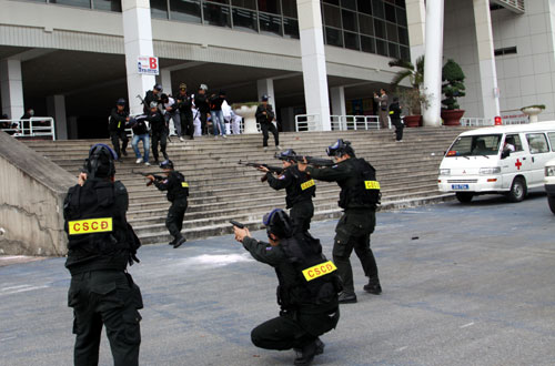 Theo tình huống đặt ra, bọn khủng bố đã chiếm giữ Bưu điện TP Hà Nội, bắn chết bảo vệ.