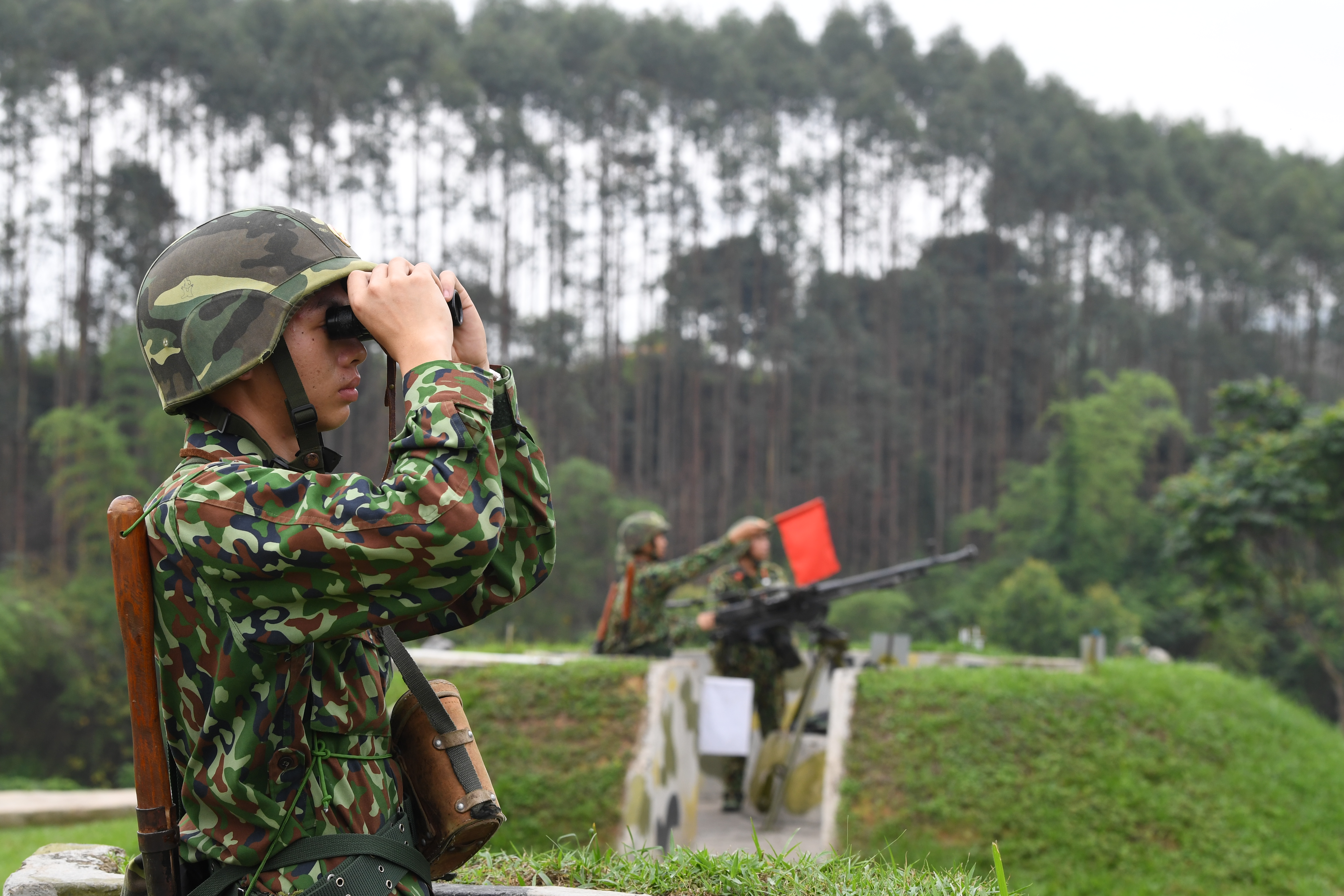 Quan sát tình hình chờ lệnh khai hỏa của khẩu đội súng máy phòng không 12,7 ly.