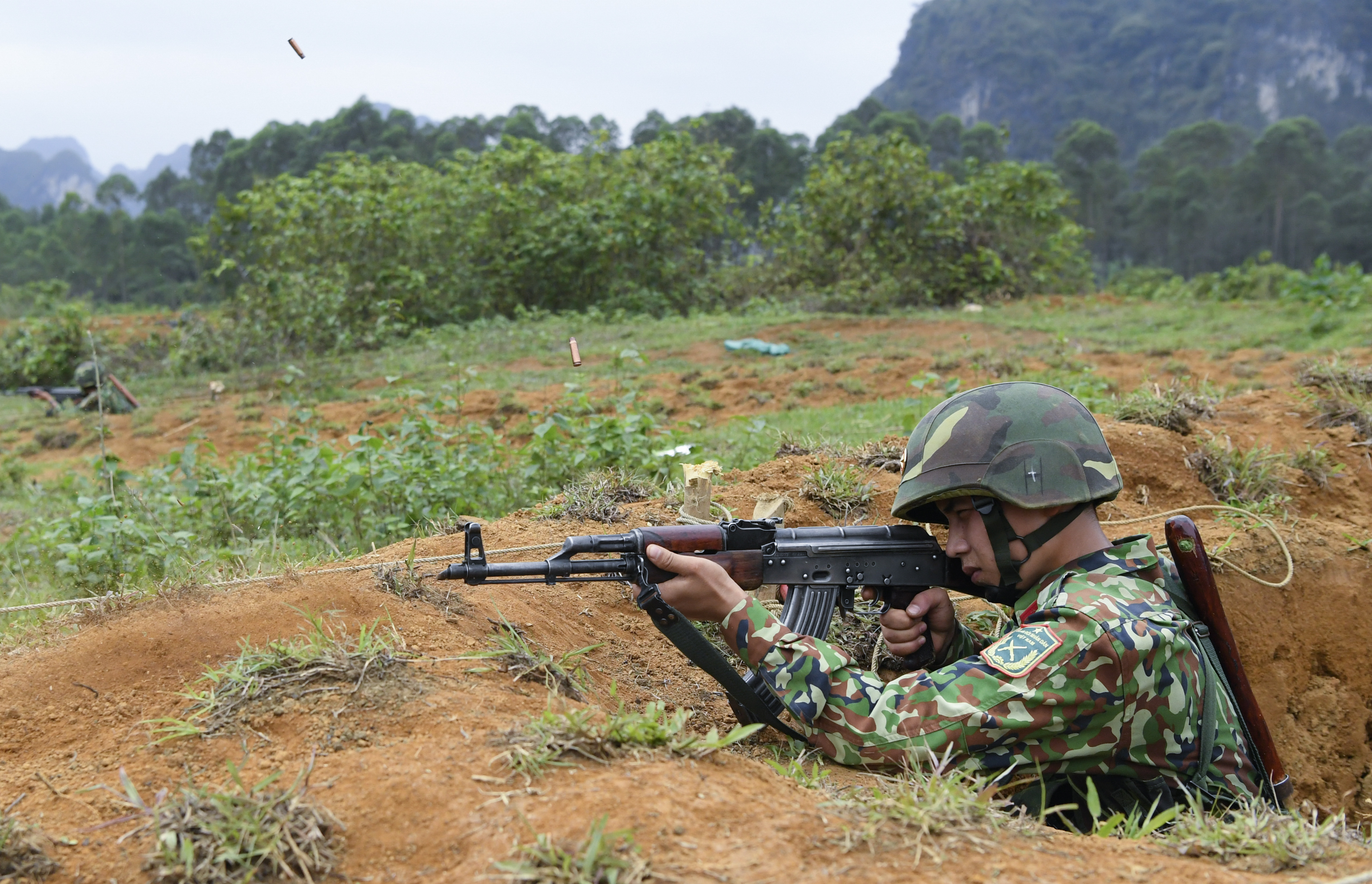 Chiến sĩ trung liên yểm trợ cho Trung đội tiến công.