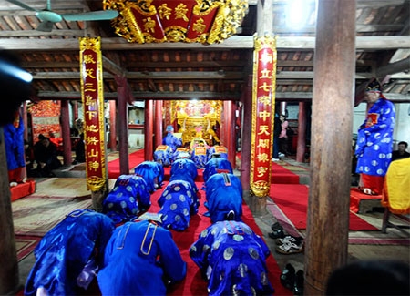 Sau khi làm lễ ở đình làng, kiệu rước và quan quân vào đền Thượng rước “Vua” về đình làng.