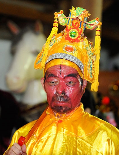 "Chúa" được hoá trang mặt đỏ, tay cầm bảo kiếm uy nghi