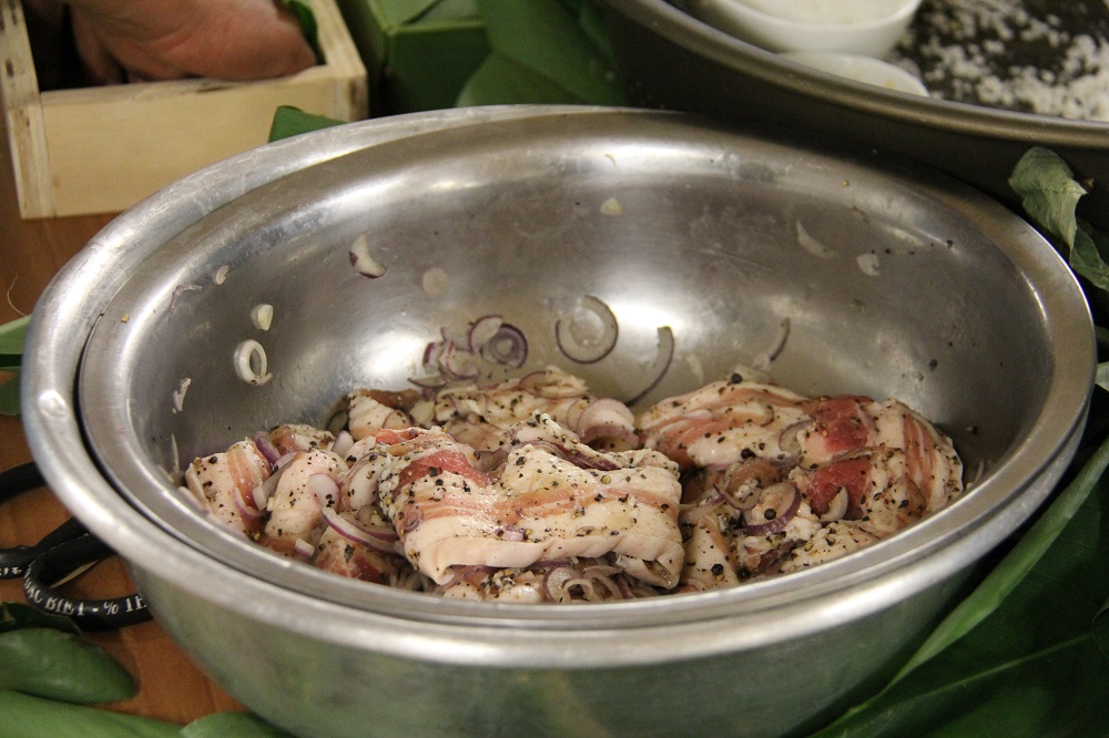 Các loại nguyên liệu gói bánh chưng, bánh tét đã được ngâm, tẩm ướp sẵn sàng.