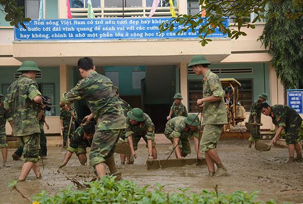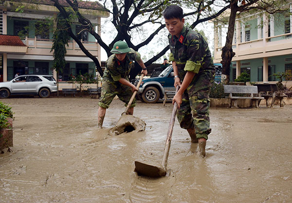 Cán bộ, chiến sĩ Lữ đoàn Phòng không 573, Quân khu 5 đã có mặt để giúp đỡ nhà trường nạo vét bùn đất.