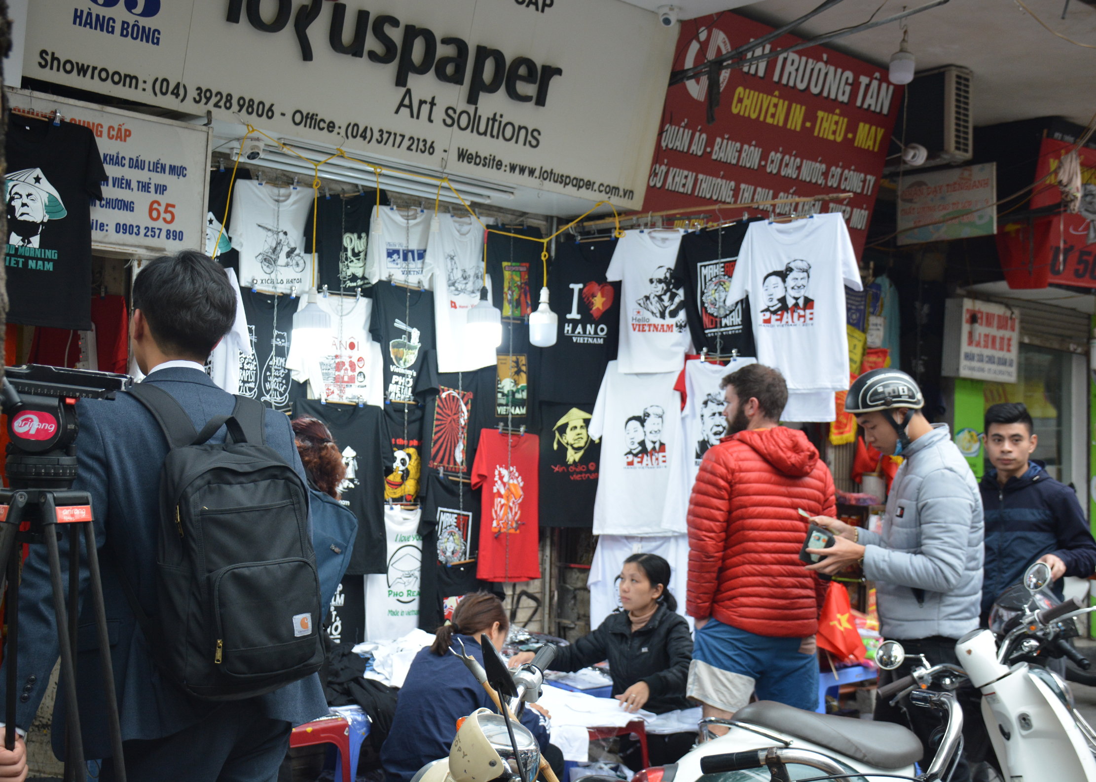 Những cửa hàng bán đồ lưu niệm trên phố Hàng Bông bày bán nhiều mẫu áo phông in hình Tổng thống Mỹ Donald Trump và Chủ tịch Triều Tiên Kim Jong-un hoặc hình ảnh về hội nghị.